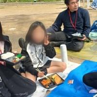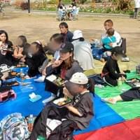 人数確認をして芝生広場へ向かいます。大きなシートを広げて、お弁当を配って、みんなで食事会です。